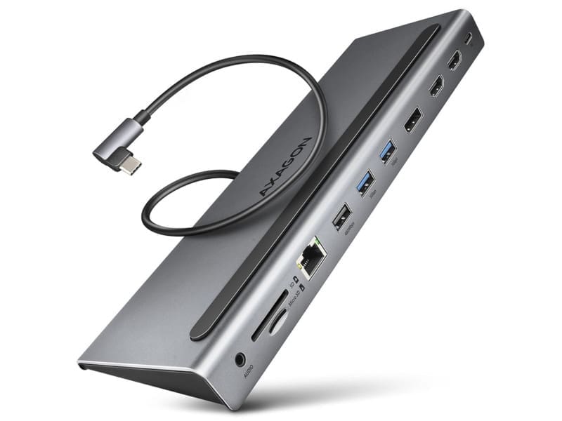 Az AXAGON HMC-HCR3A Hub egy USB hub vagy dokkolóállomás, amely összesen három USB Type-A portot biztosít. Kettő közülük 5 Gbit/s sebességgel továbbítja az adatokat az USB 3.0 szabványoknak köszönhetően, a harmadik pedig USB 2.0 szabvány. A hub USB-C porttal is rendelkezik, amely opcionálisan akár 100 W töltőteljesítményt is elérhet 5 A-en. Ez nem csak a csatlakoztatott laptop USB-C-n keresztüli tápellátását teszi lehetővé, hanem a mobil eszközök töltését is az USB-A interfészeken keresztül. Ideális többmonitoros rendszerekhez A két HDMI port és a video- és audiojelek továbbítására szolgáló mini DisplayPort port lehetővé teszi akár három monitor egyidejű csatlakoztatását 4K maximális felbontással 30 Hz-en. A 3,5 mm-es jack aljzat mikrofonnal vagy aktív hangszórókkal rendelkező fejhallgatók csatlakoztatására használható. Az eszközökről, például kamerákról a számítógépre történő egyszerű adatátvitelhez az AXAGON Hub microSD-t és SD-kártyanyílást is kínál.