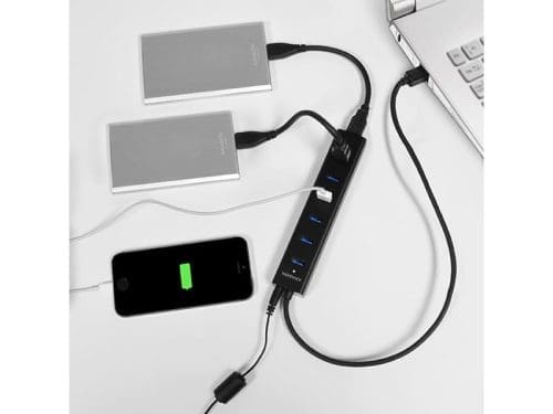 A hét portos AXAGON HUE-SA7BP ALU CHARGING USB 3.0 hub saját áramellátással és gyors töltési támogatással az összes USB portján. Egy kompakt hub tartós alumínium tokkal, mely egyszerre akár hét USB eszközt is képes a számítógéphez csatlakoztatni. Mobiltelefonok, tabletek, külső akkumulátorok és egyéb eszközök is tölthetők akár 2 amper mellett bármely hub porton keresztül, az USB Battery Charging 1.2 technológia támogatásnak köszönhetően. Képes egyszerre akár több külső merevlemezt is kezelni egyéb áramellátás nélkül. Saját áramellátásával négy, 2.5″-os külső merevlemezt képes kezelni. Az USB portok a hub teljes felületén helyezkednek el, egymástól megfelelő távolságra, hogy ne akadályozzák a nagyobb USB eszközök csatlakozását sem. A véglegesen rögzített USB kábel 40 cm-es hossza főként a laptopot használók számára ideális. Különálló töltő hubként is használható, és az adapterrel akkor is tölthetők az USB eszközök, amikor a PC nincs bekapcsolva vagy csatlakoztatva. A csomag tartalma a kompakt, 5V/2A-s tápkábel is. Tulajdonságok: • 7 downstream USB 3.0 port, elegendő hellyel a csatlakozók körül. • egy upstream USB 3.0 port USB 3.0 Type A apa csatlakozóval, amely egy 40 cm hosszú kábel végén található. • Kompatibilis az USB 3.0-val és visszafelé kompatibilis az USB 2.0 és 1.1-gyel. • Támogatja a következő átviteli sebességeket: 1.5 / 12 / 480 / 5000 Mb/s (low / full / high / super speed). • Támogatja az USB Battery Charging v 1.2 specifikációt. • Mindegyik hub port felhasználható 2 amperes töltéshez. • Lehetőség a készülék csatlakoztatására a Hot Plug támogatásának köszönhetően. • Teljes Plug and Play támogatás. • A tápcsatlakozó hub csatlakozójának LED-es kijelzése. • Túltöltés észlelése és védelem. • Hub mérete: 156 x 30 x 21 mm, AC adapter mérete: 29 x 75 x 80 mm, csatlakozóval együtt. • Hub súlya: 88 g (kábellel együtt), AC adapter súlya: 100 g (kábellel együtt). A hub áramellátó módja USB kábelen keresztül (busz áramellátás): • Az USB busz teljesítménye elegendő ahhoz, hogy ellássom egy alacsony energiafogyasztású (egér, billentyűzet, kártyaolvasó, flash lemez stb.) eszközt, vagy saját áramellátással (nyomtató, lapolvasó, 3.5″ külső lemez) a hét porthoz csatlakoztatva. • Ebben az üzemmódban az USB hub egyidejűleg akár két mágneses 2.5″ külső merevlemezzel is képes megbirkózni vagy hárommal, ha egymás után vannak kötve. • Ebben a módban lehetséges a mobilkészülékek (például az iPadek) töltése, azonban a töltőáram csak 0,9A. Saját hub áramellátás a csomagban található kábellel (saját áramellátás): • Saját áramellátás a csomagban található AC/DC adapterrel (bemenet: 100-240V~, 50/60Hz, 0.45A, kimenet: 5V-2A / 10W, két tűs Euro csatlakozó, kimeneti koax csatlakozó átmérője: 3.5/1.3 mm, 150cm-es kábel). • Ebben az üzemmódban az USB hub egyidejűleg akár négy mágneses 2.5″ mágneses külső merevlemezzel is képes megbirkózni. Javasoljuk azonban, hogy max. 3 külső 2.5″-es mágneses merevlemezt csatlakoztasson egyidejűleg a megbízható, hosszú távú hub működéshez. • A hordozható eszközök (ideértve az iPadek) gyors feltöltése akár 2A-ig mindegyik hubportban. A töltés során a hub által biztosított teljes áramot a külső tápegység kimeneti árama korlátozza max. 2 amperre. Független töltő hub mód a számítógéphez csatlakoztatás nélkül (töltő hub): • Miután kikapcsolta a csatlakoztatott PC-t, vagy anélkül, hogy a számítógéphez lenne csatlakoztatva, a hub a csomagban található hálózati töltőn keresztül működik USB töltőállomásként is. • A hordozható eszközök (ideértve az iPadek) gyors feltöltése akár 2A-ig mindegyik hubportban. A töltés során a hub által biztosított teljes áramot a külső tápegység kimeneti árama korlátozza max. 2 amperre. OR támogatás: • MS Windows XP / Vista / 7 / 8 / 8.1 / 10 vagy újabb, Windows Server 2003 / 2008 / 2012 vagy újabb (az összes 32- és 64-bites Windows rendszer támogatott), Mac OS X 10.4x vagy újabb, Linux kernel 2.6.x vagy újabb. • Megjegyzés: Az illesztőprogramok az operációs rendszerekben megtalálhatók, és teljesen automatikusan telepítésre kerülnek. Nincs szükség más drivert telepíteni, és el sem érhetők. A csomag tartalma: • USB 3.0 hub rögzített 40 cm-es kábellel, • tápadapter, • többnyelvű kézikönyv CZ / DE / DK / ENG / ESP / FIN / FR / GR / HR / HU / IT / NL / PL / PT / RO / RU / SK / SWE / TR / BG / CN / ARA, • kartondobozba csomagolva.
