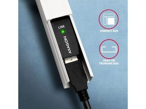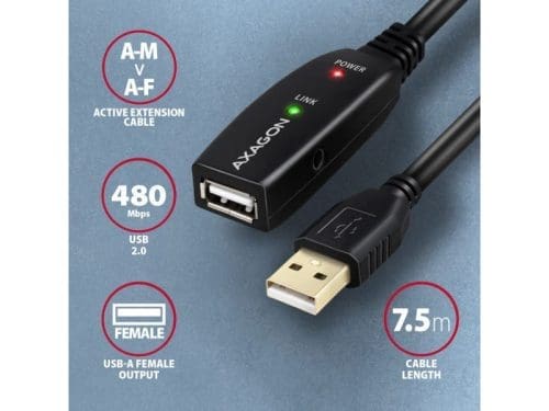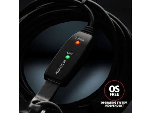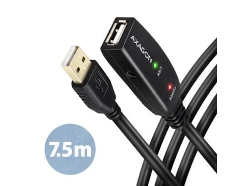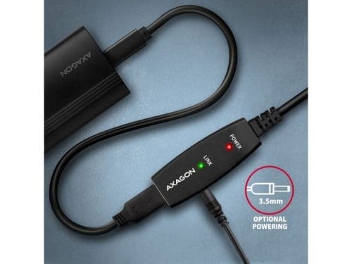 Az AXAGON ADR-207 aktív USB 2.0 hosszabbítókábel 7.5 méteres hosszúságban ideális számítógépének olyan USB-eszközökkel való összekapcsolására, mint az egér, billentyűzet, webkamera, nyomtató, szkenner, plotter és mások. Az aktív USB ismétlőkábel felerősíti az átvitt jelet, és lehetővé teszi az USB-eszköz csatlakoztatását lényegesen nagyobb távolságban, mint amit a passzív kábel lehetővé tenne. A kábel hatótávolsága további kábelek egymás utáni csatlakoztatásával tovább növelhető. Az ADR-207 kábel nagy előnye a beépített kiegészítő tápcsatlakozó. A legtöbb esetben elegendő a tápellátás az USB buszon keresztül, de nagyobb energiaigényű eszközöknél hosszabb távolságok esetén az USB tápellátás elégtelen lehet, és a hálózati áramellátás megoldhatja ezt a problémát. A kivételesen kompakt ismétlőkábeles ház lehetővé teszi a problémamentes használatot elektromos szerelőcsatornákban vagy kábelrendszerekben. A kiváló minőségű árnyékolt kábel használata nagy adatátviteli sebességet és minimális zavaró interferenciát biztosít. Bemenet: • USB 2.0 a számítógéphez való csatlakozáshoz • USB Type A (M) male (apa) csatlakozó Kimenetek: • USB 2.0 távoli USB-eszköz csatlakoztatásához • USB típusú A (F) female (anya) csatlakozó • Átviteli sebességt 480 / 12 / 1.5 Mbit/s (high / full / low speed) Áramellátás: • A kábel és a csatlakoztatott eszközök tápellátása USB-buszon keresztül történik (5V – 500mA busz üzemmód). • A legtöbb USB-eszközhöz elegendő az USB-buszon keresztüli tápellátás, és nincs szükség kiegészítő tápfeszültségre. • A kábel aktív része tartalmaz egy csatlakozót (O 3,5 x 1,3 mm külső x belső átmérő) az 5 V / 1-2 A további külső tápegységhez. • Egy 1.2 m hosszú USB A-M / 3.5 mm-es jack csatlakozós tápkábelt a csomagban. A kábel lehetővé teszi a tápellátást egy szabványos mobiltelefon-töltőről, amelynek USB-A kimenete 5V / min. 1A, pl. AXAGON ACU-QC18. • Amikor az átjátszó kábelt az adapterrel táplálja, egy külső 2.5″-es lemez csatlakoztatható anélkül, hogy saját áramforrásra lenne szüksége a lemezhez. • Hosszabb USB útvonal esetén többszörös átjátszó kábellel csatlakoztatva, az USB-busz tápellátása nem megfelelőnek bizonyulhat, a külső 2.5″-os meghajtóknál alacsonyabb energiafogyasztású USB-eszközökhöz is. Ebben az esetben is segíthet a tápellátás erősítése egy hálózati adapter csatlakoztatásával. További tulajdonságok: • Teljesen kompatibilis az USB 2.0-vel és visszafelé kompatibilis az USB 1.1-gyel. • Teljes Plug and Play és Hot Plug támogatás. • Két LED jelzi az áramellátást és az USB-kapcsolatot. • Az aktív USB kábel mögött egy közös passzív USB kábel is használható. • Az aktív rész méretei 74 x 22 x 13 mm, kábelhosszúsága 10 m. • Súlya 254 g.